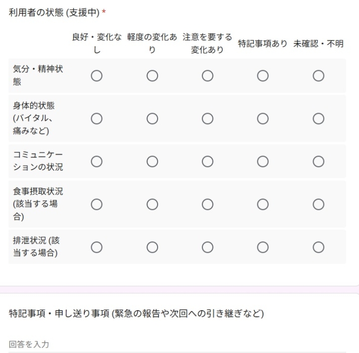 チェックボックス形式: 「気分・精神状態」「身体的状態(バイタル・痛みなど)」「コミュニケーションの状況」などの項目をタップするだけで完了するように設計。